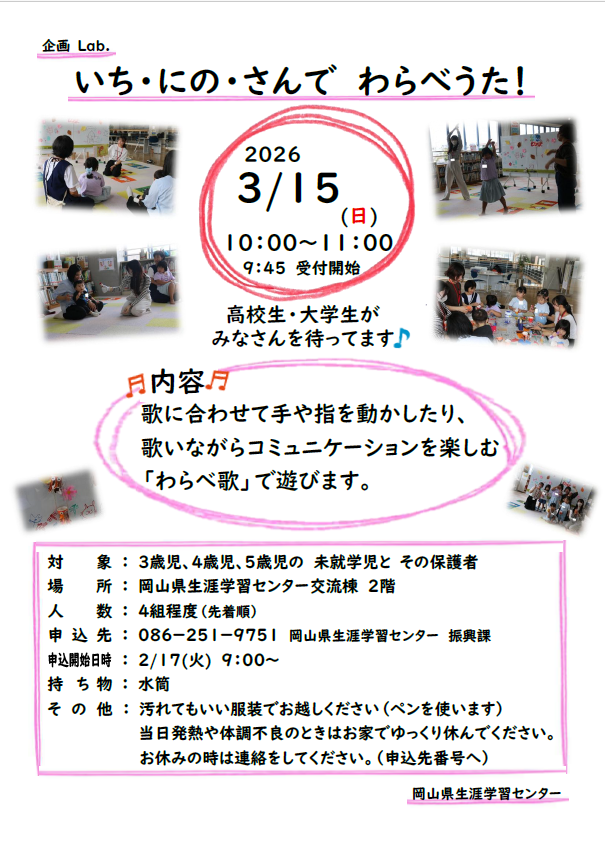 日時:2026年3月15日(日) 10:00~11:00 場所:岡山県生涯学習センター 交流棟 2階 対象:3歳児、4歳児、5歳児の未就学児とその保護者 人数:4組程度(先着順) 申込開始日:2026年2月17日(火)9:00から |